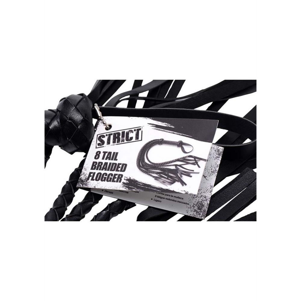 Maak impact tijdens je volgende speelsessie! Je partner die houdt van een beetje pijn met hun plezier zal de steek van deze flogger elke keer dat deze op hun tere huid landt geweldig vinden. Neem een stevige grip op het dikke, geweven handvat en zwaai de acht lange staarten met zorgvuldig gemeten kracht. Hoeveel kan jouw speelpartner aan? Wanneer de uiteinden hun doel raken, word je beloond met gekreun van pijnlijke vreugde. Een lus stelt je in staat om de flogger tijdens gebruik om je pols te bevestigen en deze handig aan een haak op te bergen wanneer je klaar bent. Afmetingen: 86 cm in totale lengte, handvat meet 16,5 cm, staarten meten 56 cm. Materiaal: PU leer. Kleur: Zwart.