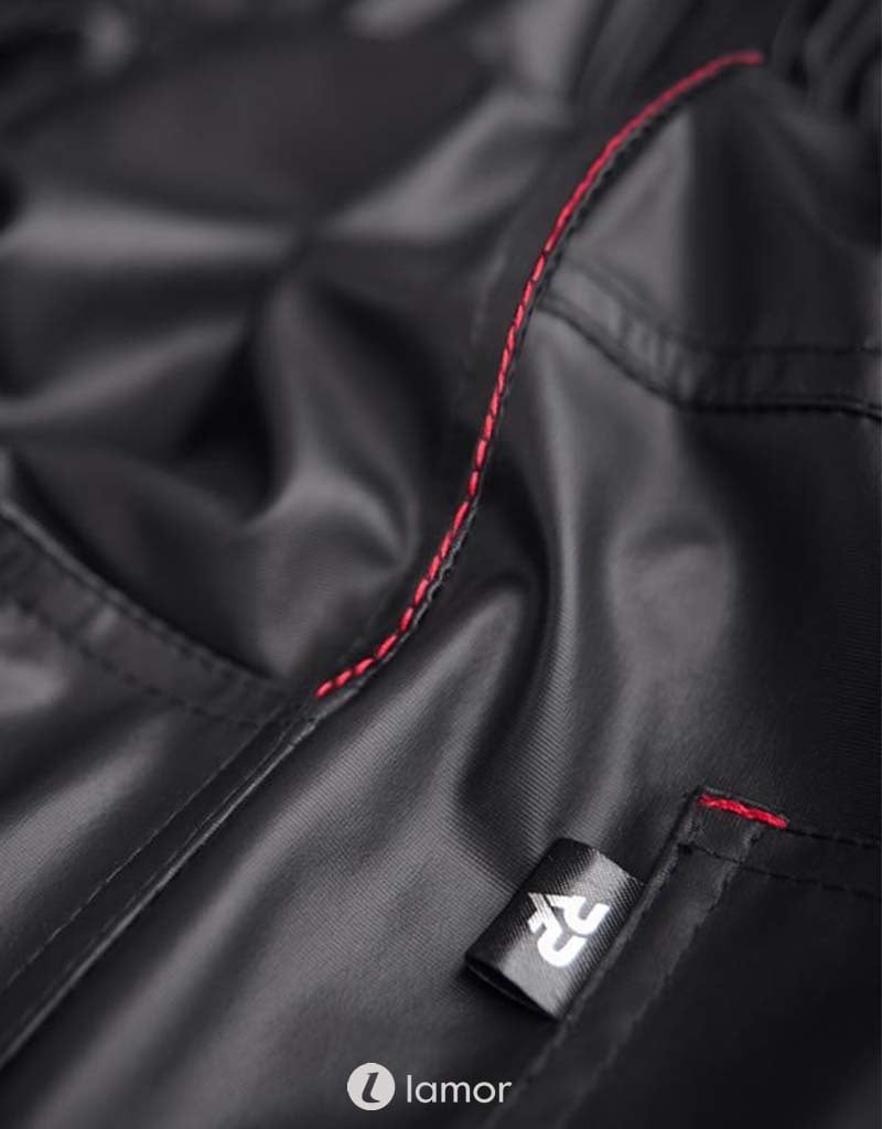 Lage taille broek. Geheel gemaakt van elastisch, zwart wetlook materiaal. Ze zien er fenomenaal uit. De lage taille, smallere heuplijn benadrukken sensueel de vorm van de billen. De achterzakken zijn ook verlaagd om hun vorm nog meer te benadrukken. Zakken aan de voor- en achterkant zijn een praktische oplossing. De broek heeft riemlussen. Rode alcantara-patch met lasergebrand RFP-logo en rode stiksels benadrukken het unieke karakter van het product. .