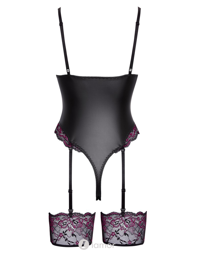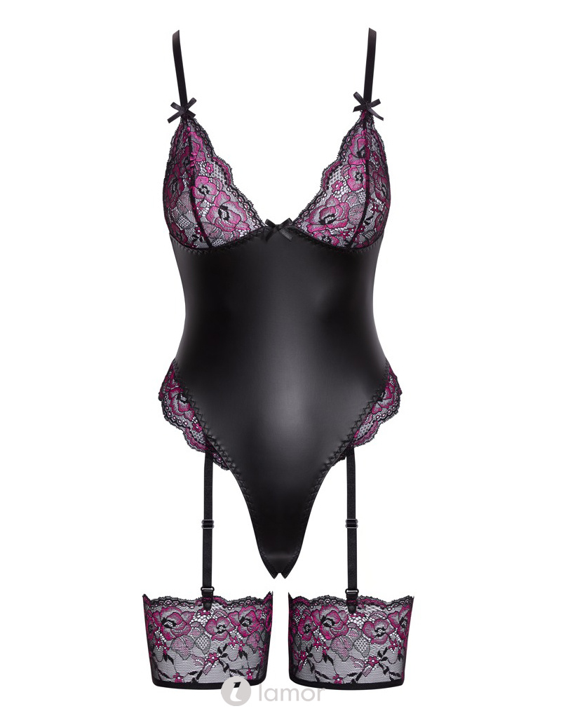 Cottelli LINGERIE Straps-Riobody – Zwarte Mattlook met Roze-Zwarte Kant, Verstelbare Strapse & Drukknoopsluiting