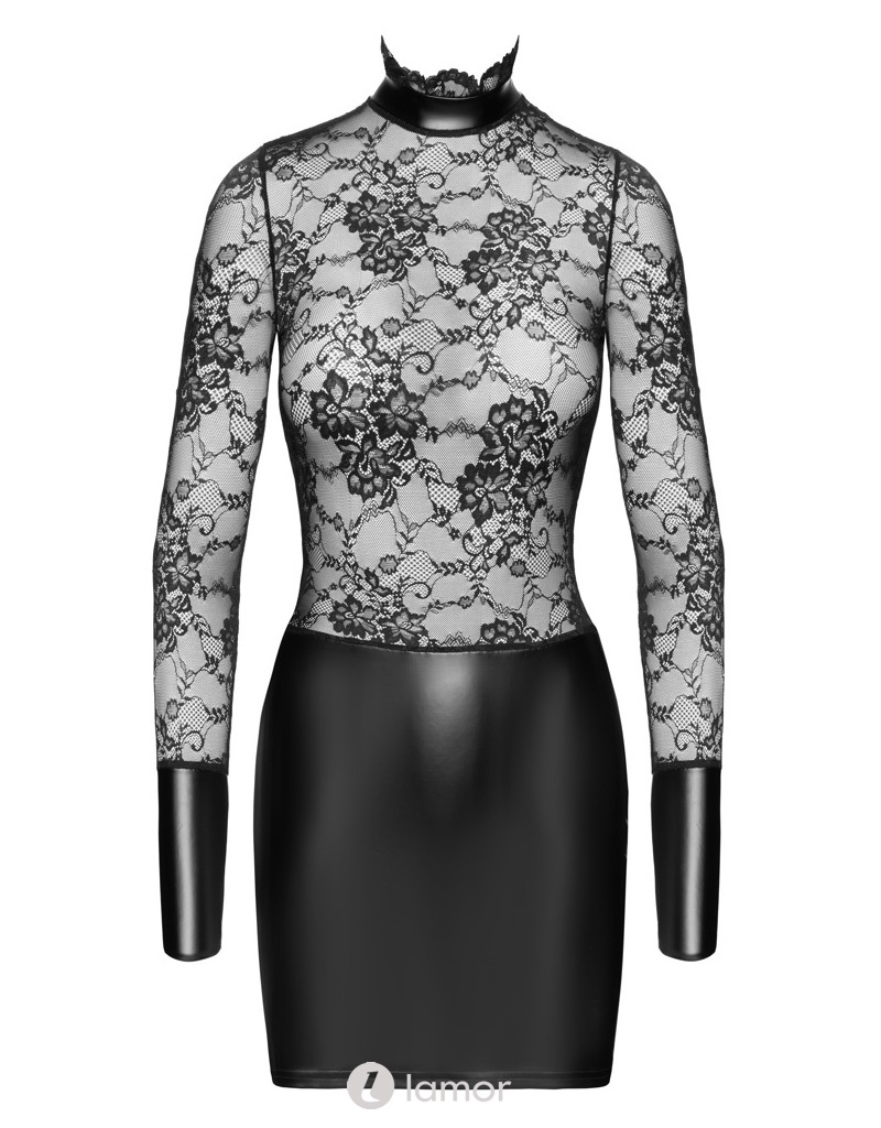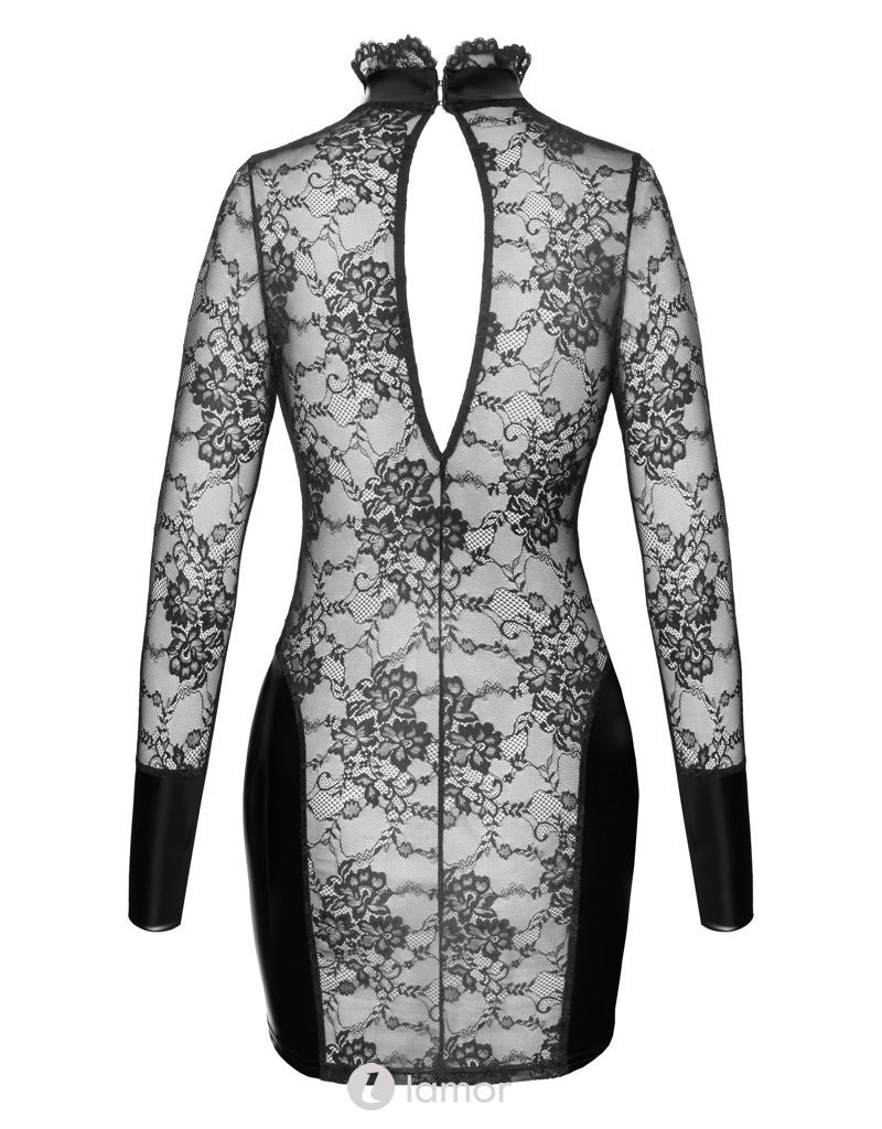 Noir Handmade Minijurkje van zwarte kant met Powerwetlook details, lange mouwen en taillering