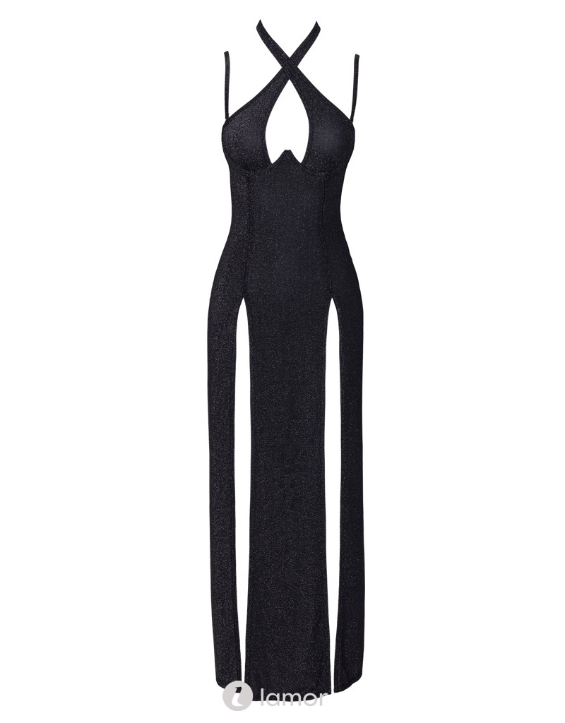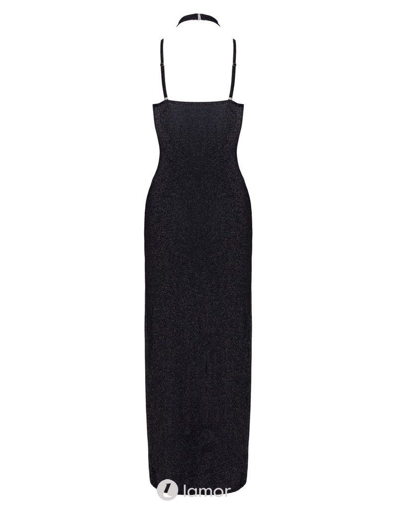 Cottelli Party lang zwart glitterjurk met zilverglans, balconette cups, neckholder en dubbele hoge split