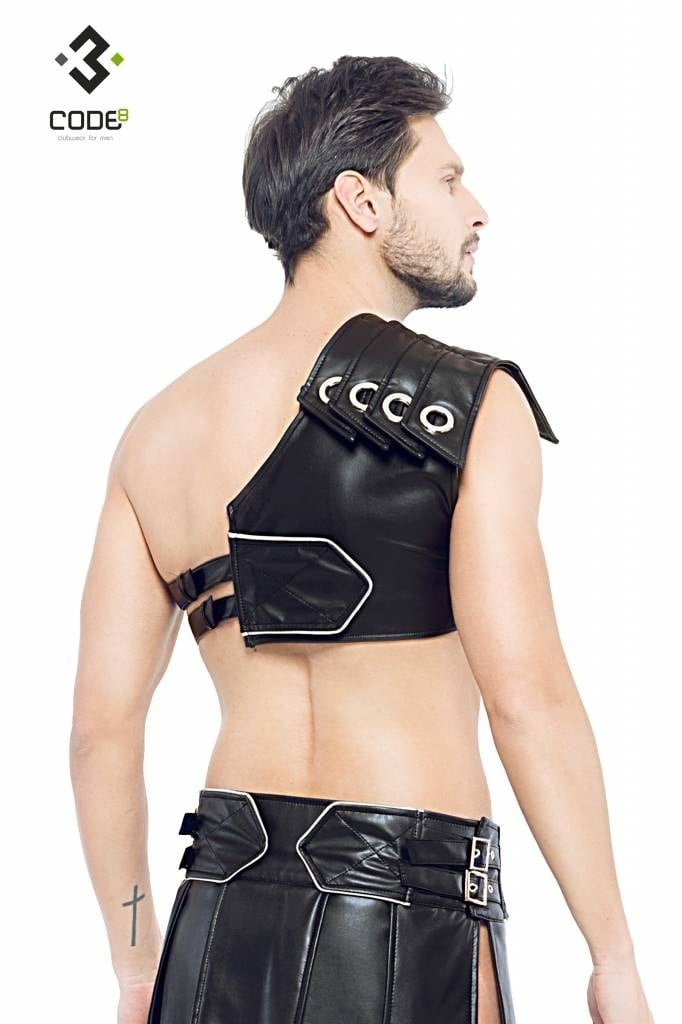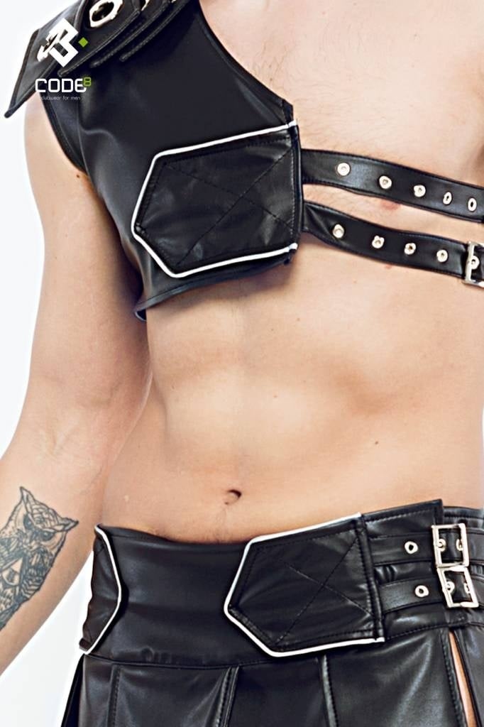 Eco-Leren Gladiator Harnas met zilverkleurige biezen.Dit stoere Harnas is door de riempjes aan te passen en biedt een optimaal draagcomfort.