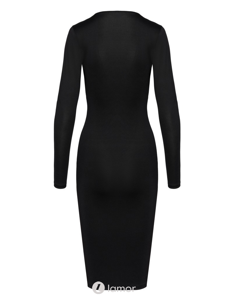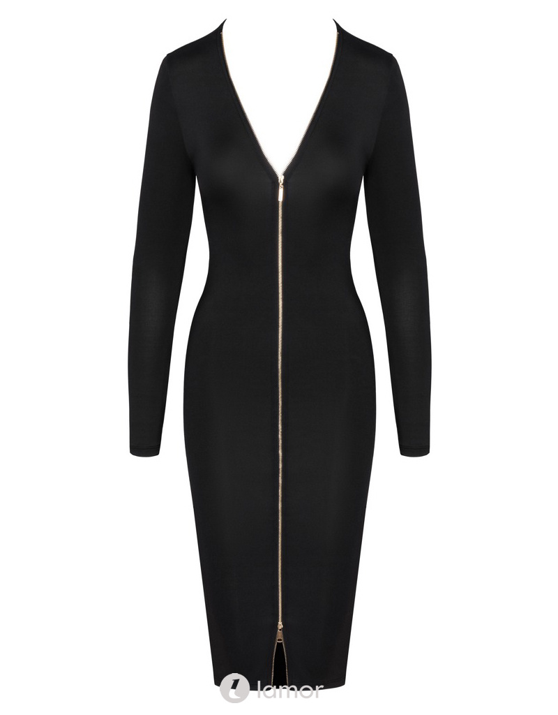 Cottelli PARTY Zwarte Midi Jurk met Lange Mouwen – Strakke Pasvorm & Gouden 2-Weg Rits voor Verleidelijke Look
