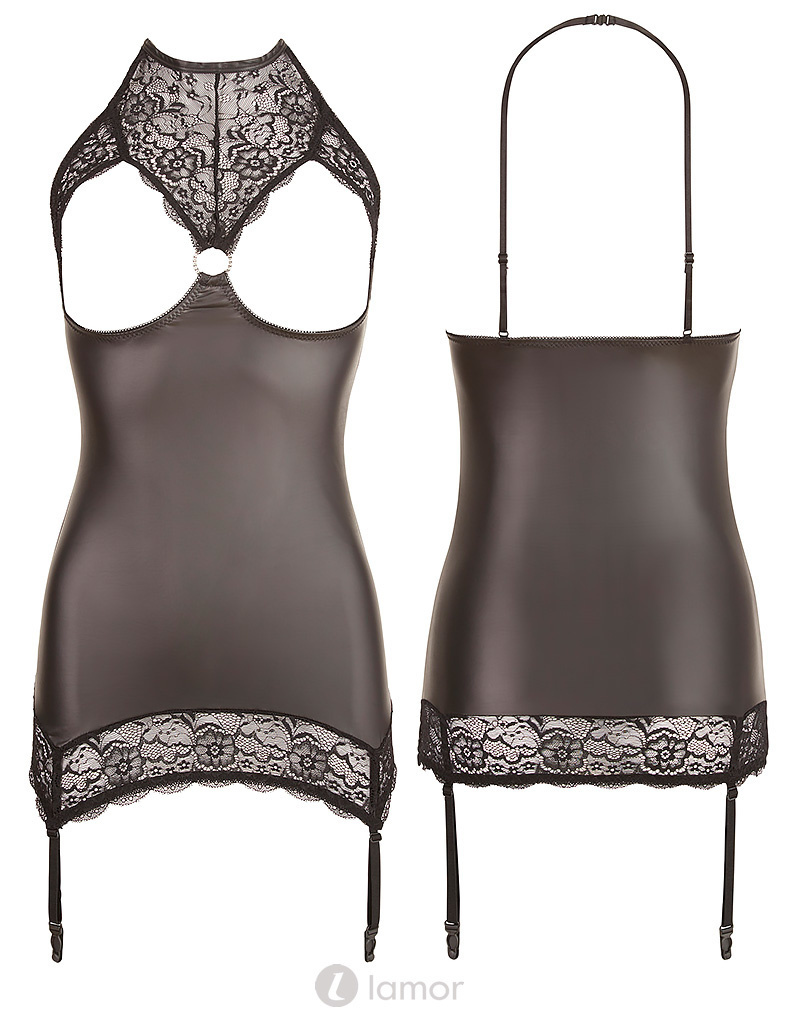 Sensualiteit, stijl, finesse! Borstvrije lingeriejurk met edele kanten inzetstukken en een strass-ring bij het decollete. Opwindend glanzend, aangenaam elastisch en absoluut perfect passend. Verstelbare riemen en jarretellen..