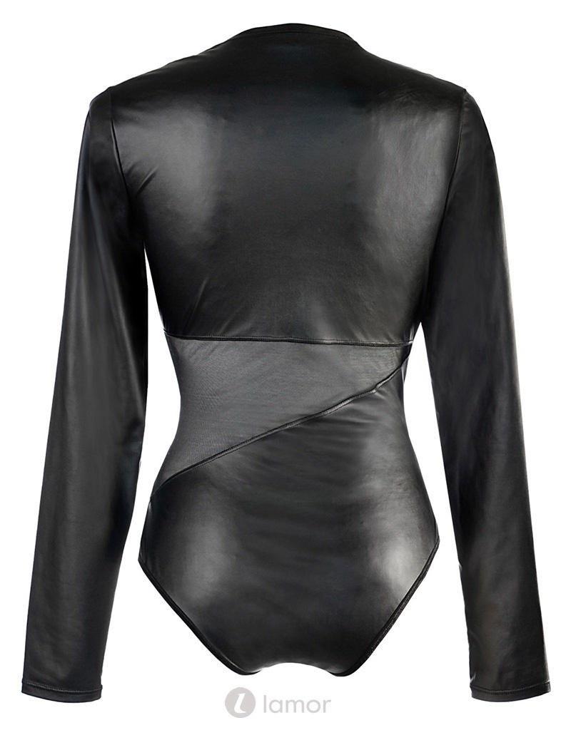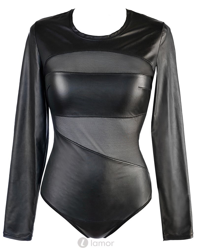Uniek verfijnde body in zwart transparant tule en lederlook