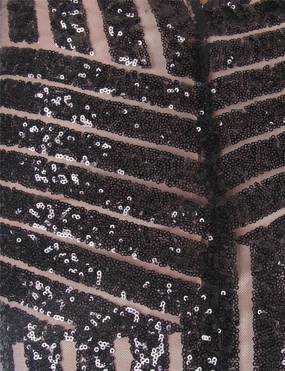 Dit bodycon jurkje heeft korte mouwen en een diepe halslijn. Op de rug zit een ritssluiting. Het jurkje is huidkleurig en bedekt met zwarte glimmende pailletjes. De jurk heeft een split aan de voor en achterzijde.