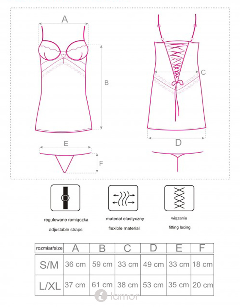 Verleidelijke en sensuele zwarte chemise gemaakt van zacht elastisch tulle waardoor het zich goed aanpast aan het lichaam. Dit model heeft dunne, verstelbare bandjes,vetersluiting op de rug en een interessant bandje over de borsten, die de borsten nog meer benadrukken. De chemise wordt geleverd inclusief string, waardoor het geheel bestaat uit een prachtige exclusieve set erotische lingerie gericht op iedere vrouw.