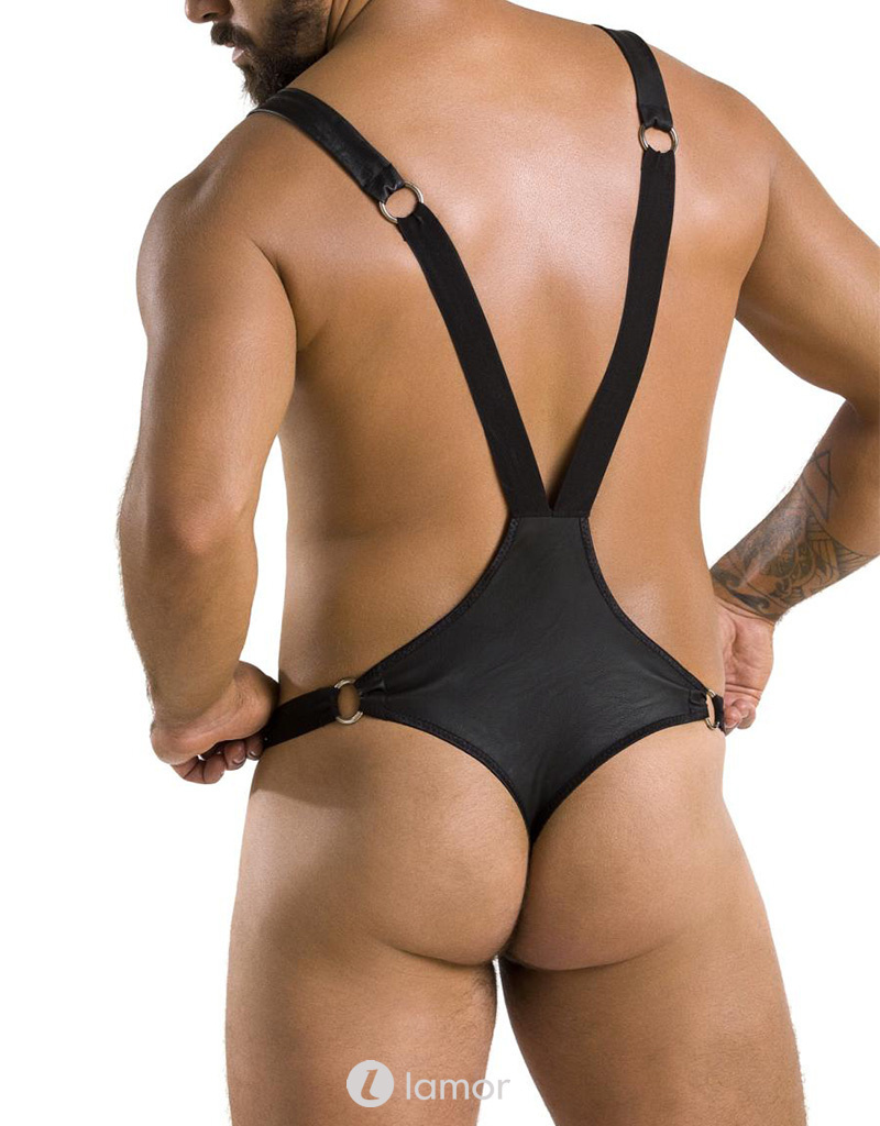 Sexy heren stringbody van lederlook materiaal van Passion Menswear