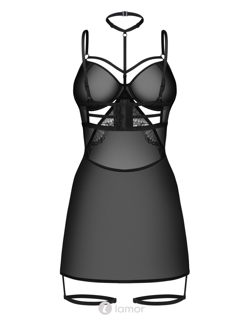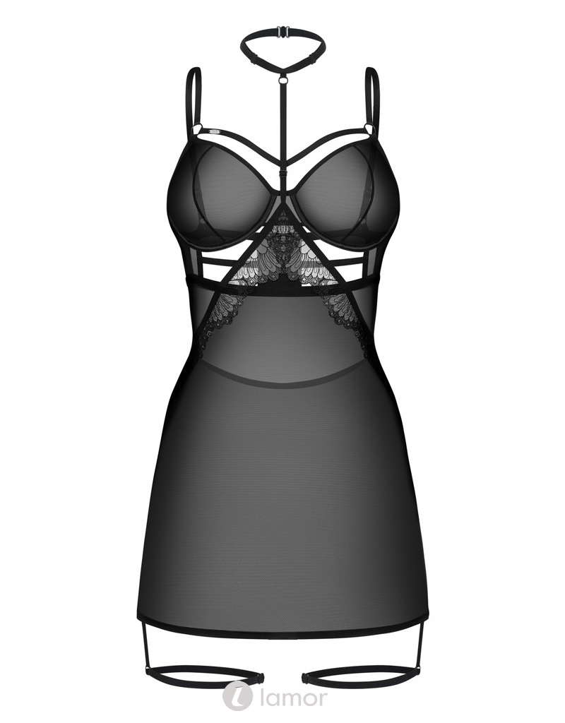 Obsessive Arrowel Negligé – Zwart Transparant Lingeriejurkje met Kant, Beugelcups, Halsband & Straps